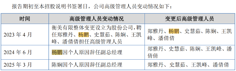 由此可见,2024年6月,公司董事、副总经理杨鹏离职,2025年1月2日,华泰联合证券与衡美健康签署IPO辅导协议。1月13日,浙江证监局正式受理公司辅导备案。3月4日,衡美健康成功挂牌新三板。3月18日,董事JIANG WEIMING因个人原因辞职。3月31日,副总经理陈娴提交辞呈。