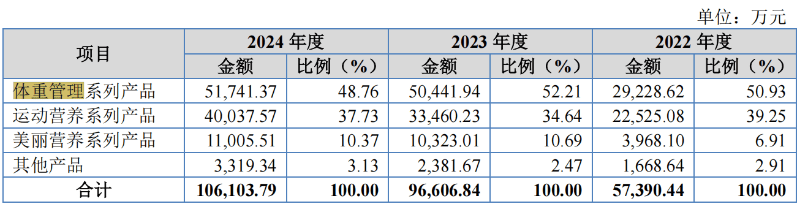 值得注意的是,收入占比最高的体重管理类产品的单价也出现了“断崖式”下降。报告期内该类产品的销售单价分别为67.25元/kg、52.97元/kg和57.94元/kg,在2024年有所回升,但仍远低于2022年的销售单价。