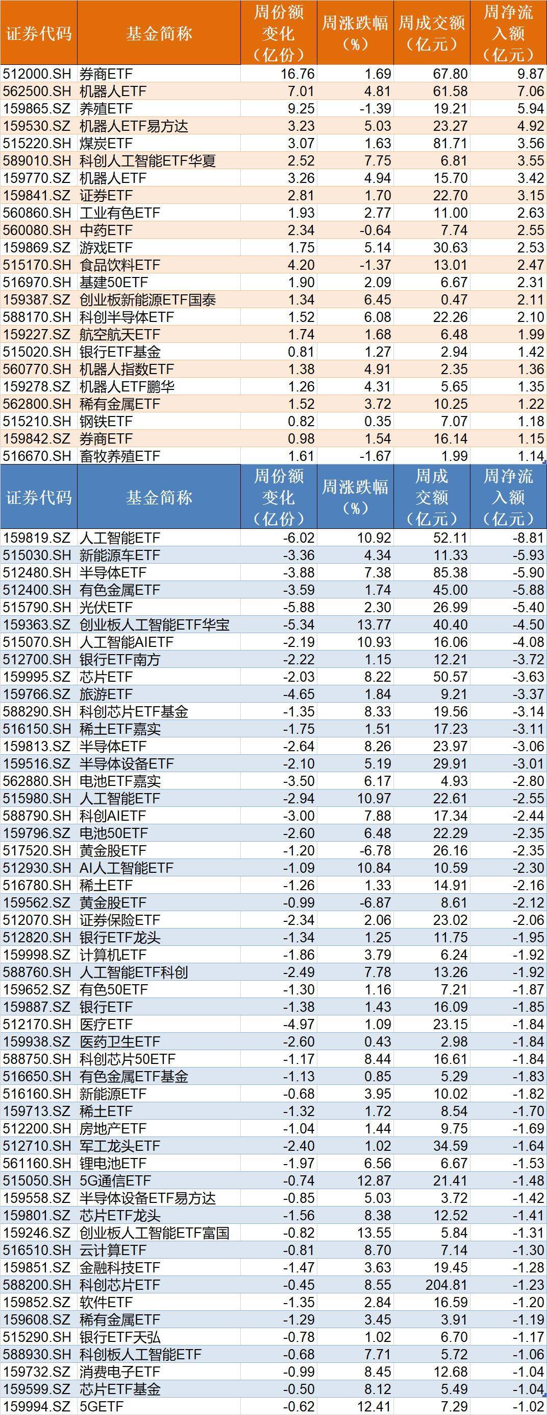 沪深两市股票型ETF和跨境型ETF本周合计净流出逾200亿元。行业主题上看,券商、机器人等ETF被资金看好,而人工智能、新能源车相关ETF被资金抛售。