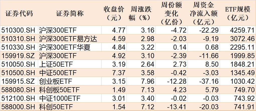 具体ETF方面,规模较大的10只宽基指数ETF本周合计净流出88.41亿元,其中创业板ETF净流出37.16亿元,沪深300ETF、科创50ETF净流出逾20亿元。
