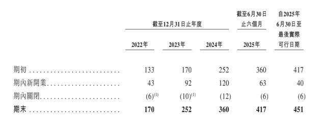 近几年,遇见小面的扩张速度持续加快。招股书显示,2022年末,遇见小面门店数为170家,2023年末增至252家,2024年末进一步达360家,2025年上半年升至417家,三年多时间里,遇见小面以近“三天开一店”的惊人速度扩张,整体呈现加速增长的规模化趋势。这一快速扩张的势头在2025年仍在延续,截至10月8日,遇见小面的门店总数已达451家,其中内地440家,香港11家,另外还有101家新店筹备中,预计年内可突破500家,其中直营门店占比近八成。