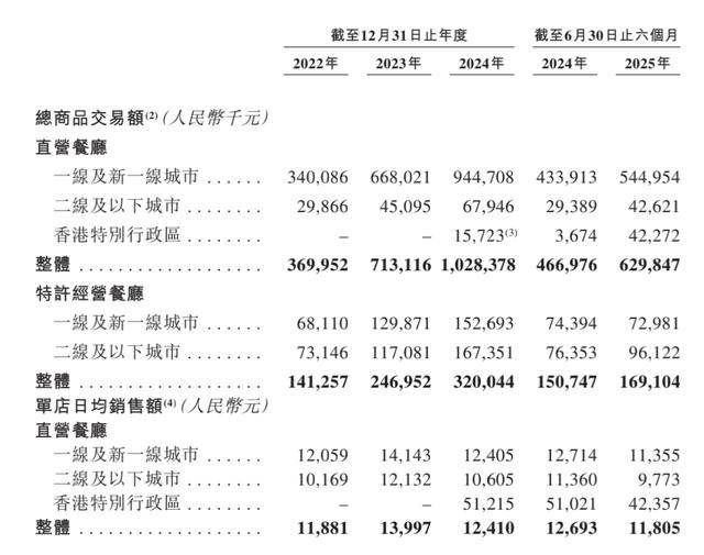 然而,降价并未带来预期的客流增长。从招股书来看,以直营门店为例,整体翻座率2022年为3.1次/天,2023年提升至3.9次/天,同比增加25.8%,2024年微降至3.8次/天,2025年上半年进一步降至3.4次/天,同比2024年上半年下滑10.3%,较2023年翻座率峰值下滑12.8%。