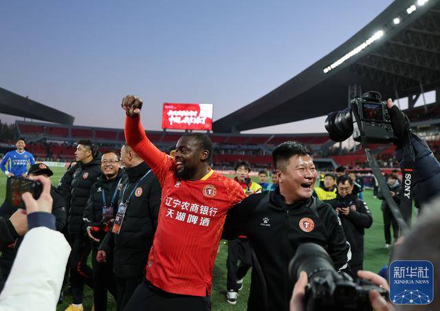 ↑ 辽宁铁人队球员邦本宜裕(左二)在进球后与队友庆祝。新华社记者 吴青昊 摄