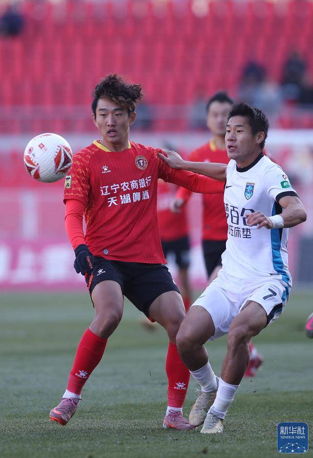 ↑ 辽宁铁人队球员田德澳(左)在比赛中射门。新华社记者 吴青昊 摄