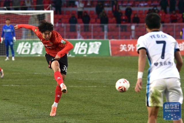 ↑ 辽宁铁人队球员邦本宜裕(右一)在比赛中射门。新华社记者 李钢 摄