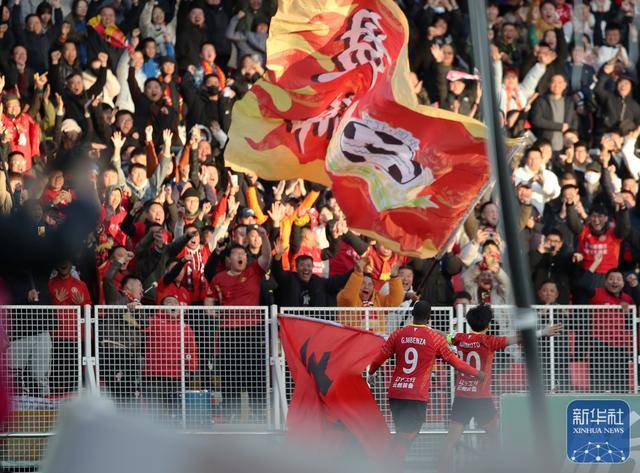 ↑ 辽宁铁人队球员邦本宜裕(前右)在比赛中庆祝进球。新华社记者 李钢 摄