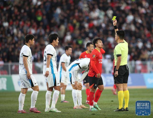 ↑ 辽宁铁人队球员臧一锋(右二)在比赛中被主裁判出示黄牌。新华社记者 李钢 摄