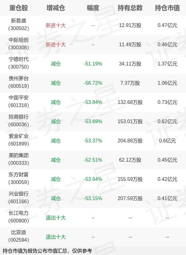 证券之星消息,10月27日银华基金旗下马君 谭跃峰管理的银华中证A500交易型开放式指数基金公布三季报,近1年净值增长率23.39%。与上一季度相比,该基金前十大重仓股新增新易盛,中际旭创;其中宁德时代持仓占比3.91%,为该基金第一大重仓股;长江电力,比亚迪等退出前十大重仓股;详细数据如下: