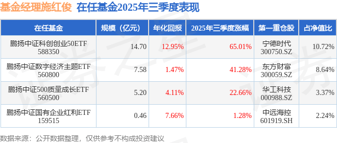 证券之星消息,截止2025年三季度末,基金经理施红俊旗下共管理4只基金,本季度表现最佳的为鹏扬中证科创创业50ETF(588350),季度净值涨65.01%。