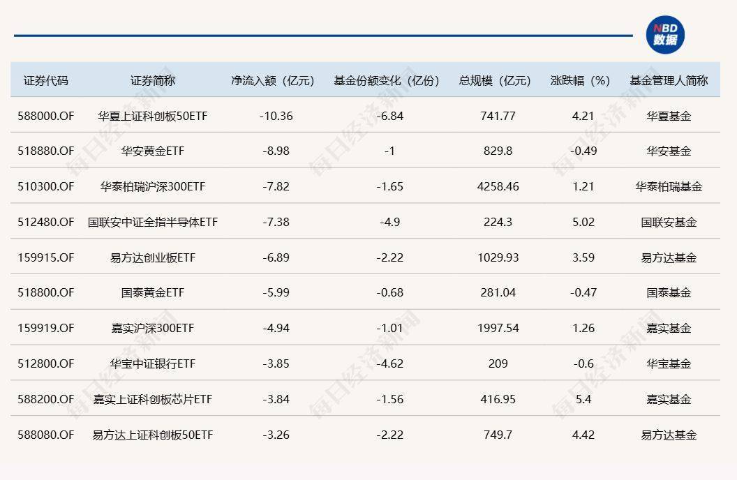 与此同时,华夏上证科创板50ETF基金份额减少6.84亿份,净流出额为10.36亿元;华安黄金ETF基金份额减少1.00亿份,净流出额为8.98亿元;华泰柏瑞沪深300ETF基金份额减少1.65亿份,净流出额为7.82亿元。