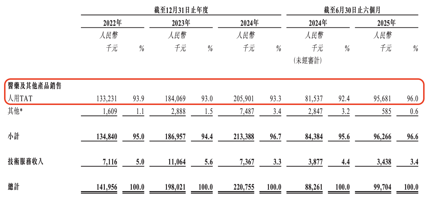 据悉,江西生物的主要收入来源为销售人用TAT,分别占公司截至2022年、2023年及2024年1 2月3 1日止年度以及截至2024年及2025年6月3 0日止六个月总收入的93.9%、93.0%、93.3%、92.4%及96.0%。