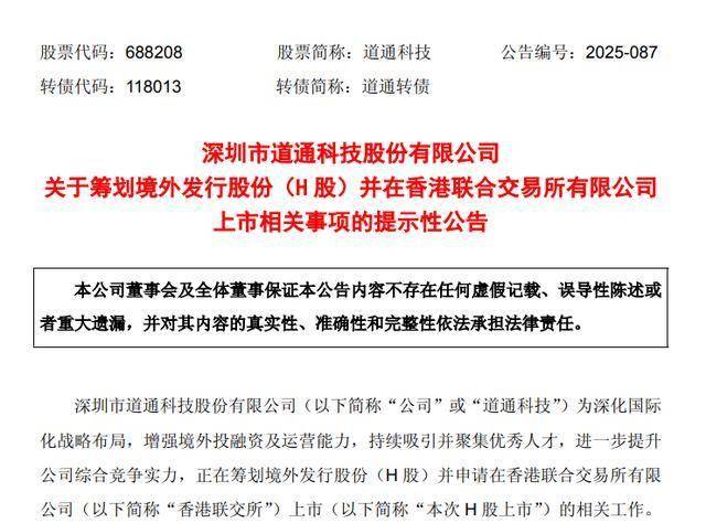 瑞财经 李兰 10月24日,道通科技(688208.SH)发布公告,公司正在筹划境外发行股份(H 股)并申请在香港联交所上市的相关工作。