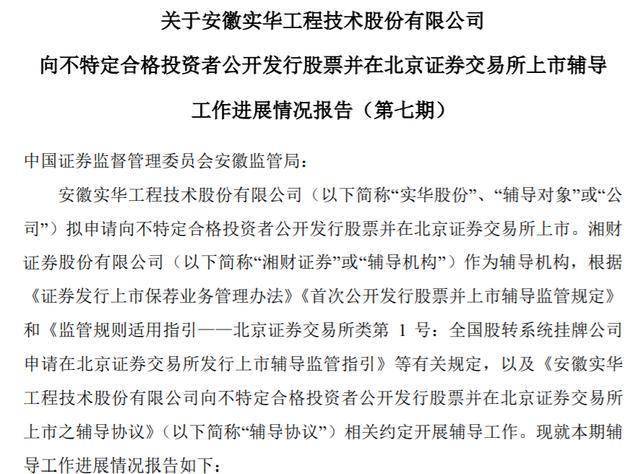 瑞财经 王敏 10月27日,安徽实华工程技术股份有限公司(以下简称“实华股份”)披露关于首次公开发行股票并上市辅导工作进展报告(第七期),拟北交所上市,辅导机构为湘财证券。