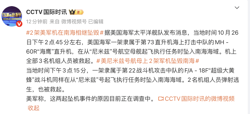 据美国海军太平洋舰队发布消息,当地时间10月26日14时45分左右,美国海军一架隶属于第73直升机海上打击中队的MH - 60R“海鹰”直升机,在从“尼米兹”号航空母舰起飞执行任务时坠入南海海域。机上全部3名机组人员被救起。