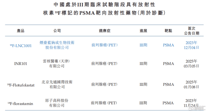 18F-LNC1001是中国首款进入III期临床试验的PSMA靶向放射性药物,其开发用于PSMA阳性前列腺癌患者的PET影像。