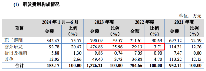 再从研发投入规模来看,公司报告期2021年至2023年研发费用分别为932.11万元、784.66万元、1326.21万元,其中2023年增至千万元以上,主要是由于当年委外研发费从上年29万元增至477万元。