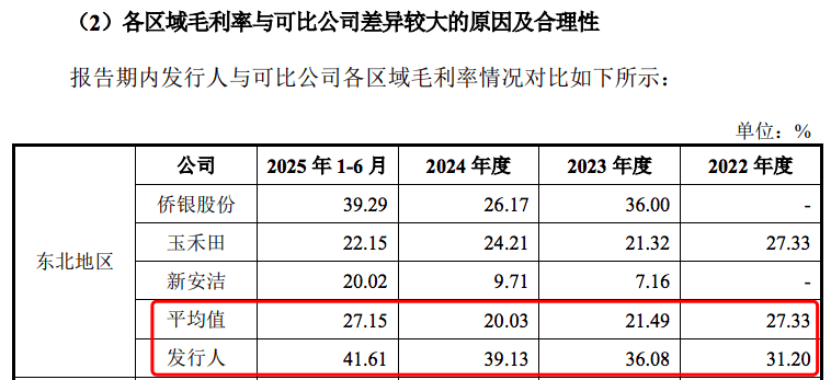 二轮回复中,中环洁披露显示,东北地区2023年毛利率为39.13%,不仅明显高于公司在华东22.17%、华北24.35%、西北14.59%等地的毛利率水平,还较A股同行业可比公司侨银股份、玉禾田、新安洁在东北地区毛利率均值20.03%相比,高出19个百分点,其他年度毛利率也明显高于可比公司均值。