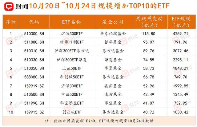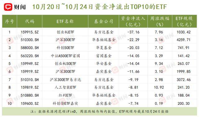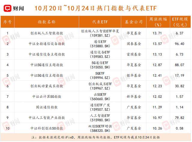 根据同花顺行业指数,10月20日至10月24日期间,消费电子、自动化设备、风电设备、通信设备及半导体等行业指数领涨,推动科技成长主线全面走强。期间,创业板人工智能ETF华夏(159381.SZ)、通信ETF(515880.SH)、5GETF(159994.SZ)以及通信ETF广发(159507.SZ)等科技类ETF涨幅居前,表现亮眼。