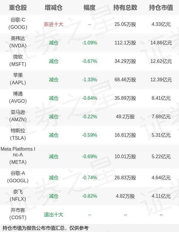 证券之星消息,10月28日国泰基金旗下艾小军管理的纳斯达克100交易型开放式指数基金公布三季报,近1年净值增长率23.91%。与上一季度相比,该基金前十大重仓股新增谷歌-C;其中英伟达持仓占比8.95%,为该基金第一大重仓股;开市客等退出前十大重仓股;详细数据如下: