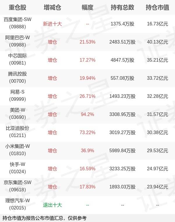 证券之星消息,10月28日华夏基金旗下徐猛管理的华夏恒生科技交易型开放式指数基金(QDII)公布三季报,近1年净值增长率35.39%。与上一季度相比,该基金前十大重仓股新增百度集团-SW;并对阿里巴巴-W增仓439.92万股,为该基金第一大重仓股;理想汽车-W等退出前十大重仓股;详细数据如下: