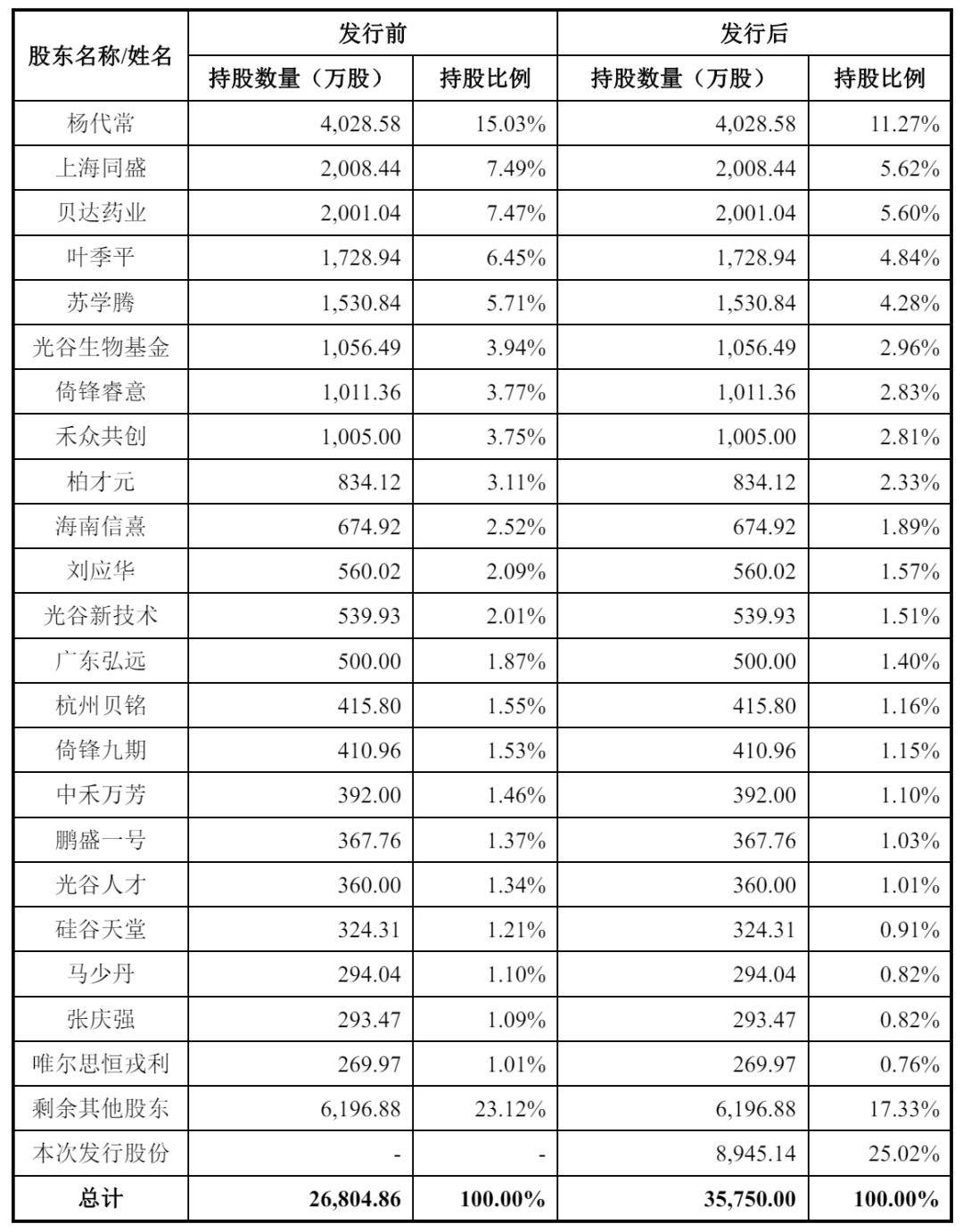 IPO后,杨代常直接持股11.27%,上海同盛持股5.62%,贝达药业持股5.6%,叶季平持股4.84%,苏学腾持股为4.28%,光谷生物基金持股2.96%,倚锋睿意持股2.83%,禾众共创持股2.81%,柏才元持股2.33%;