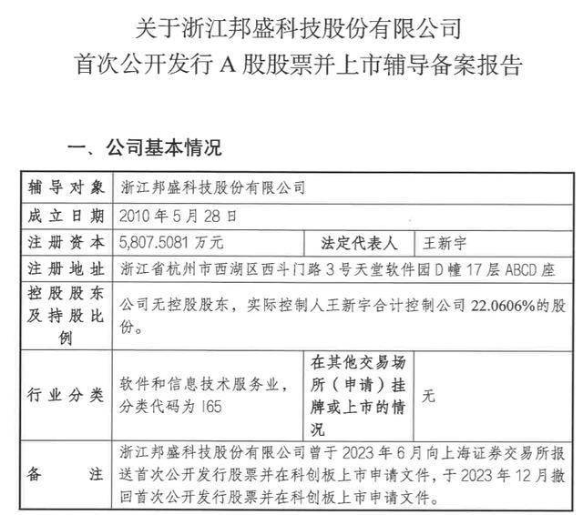 邦盛科技曾于2023年6月向上海证券交易所报送首次公开发行股票并在科创板上市申请文件,于2023年12月撤回首次公开发行股票并在科创板上市申请文件。
