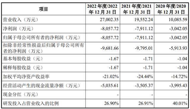 业绩方面,2020年度、2021年度、2022年度,邦盛科技营业收入分别为1.01亿元、1.96亿元和2.70亿元;归母净利润分别为-3042.05万元、-7911.12万元和-8057.72万元。