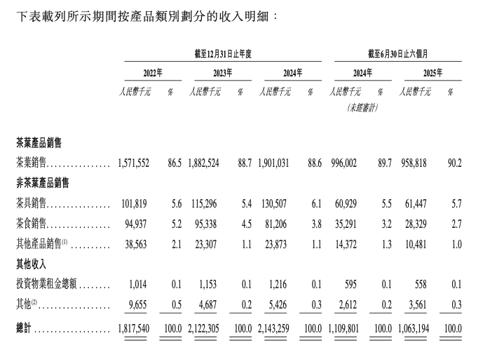 2022年、2023年、2024年和2025年上半年(下文简称“报告期内”),八马茶业加盟店数量分别为2579家、3054家、3255家、3341家,同期,来自加盟渠道的销售收入分别为9.12亿元、10.73亿元、10.90亿元及5.23亿元,分别占各期总收入的50.2%、50.6%、50.9%及49.1%。
