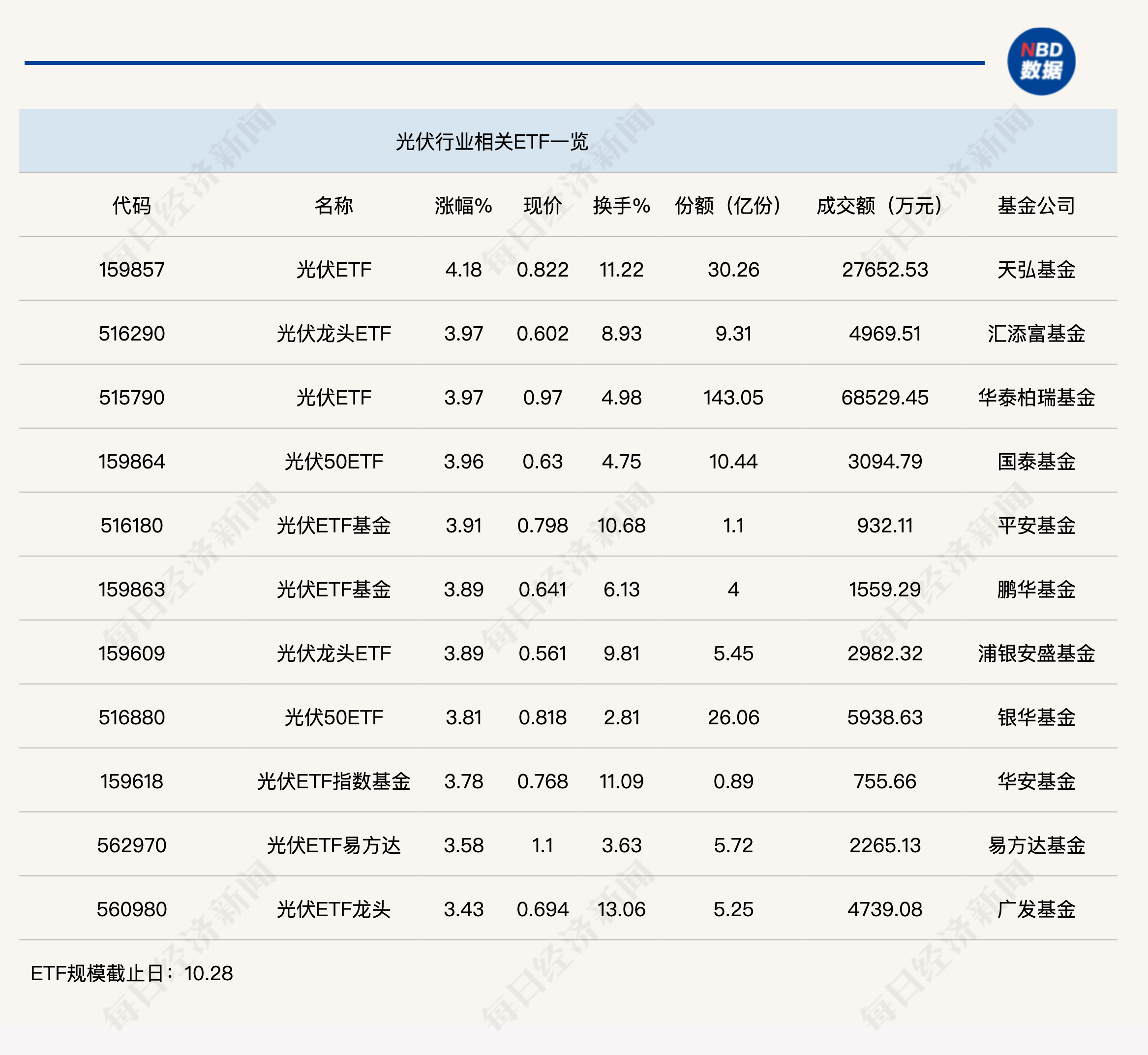 ETF涨幅榜上,光伏相关ETF今日集体走高。其中,光伏ETF(159857)半日涨幅达到4.18%,涨幅居行业、主题类ETF之首。另外,包括光伏龙头ETF(516290)在内的9只光伏产业ETF半日涨幅也均超过3.5%。