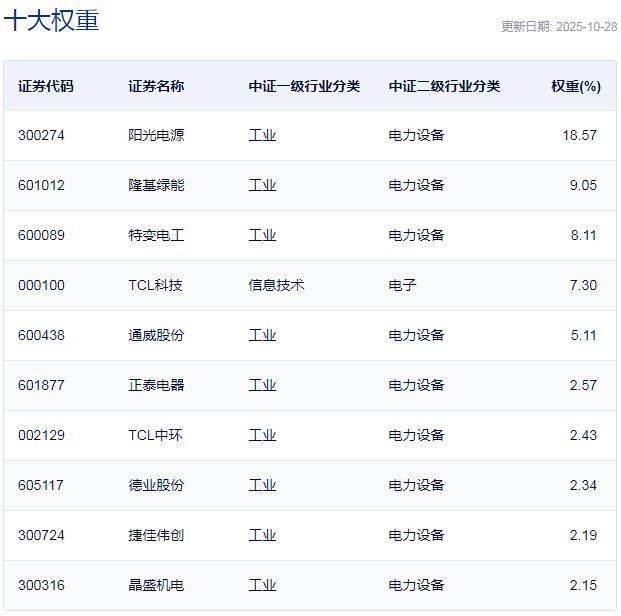 中证光伏产业指数(931151.CSI)发布于2019年4月22日,从沪深市场主营业务涉及光伏产业链上、中、下游的上市公司证券中,选取不超过50只最具代表性的上市公司证券作为指数样本,以反映沪深市场光伏产业上市公司证券的整体表现。