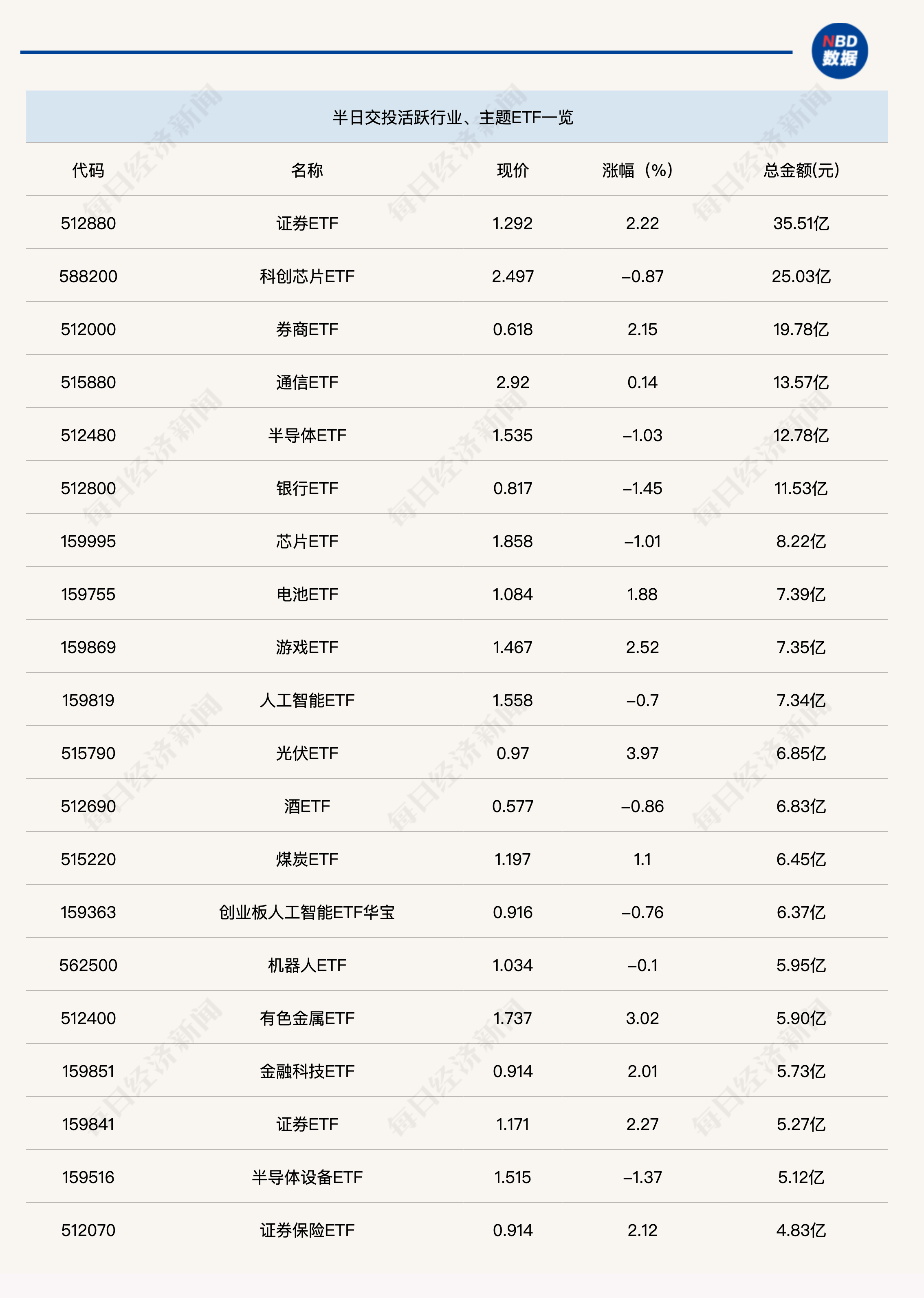 今日上午,证券ETF(512880)表现活跃,半日成交金额高达35.51亿元;券商ETF(512000)半日成交金额也近20亿元。跨境ETF方面,交易活跃性有所下降,仅香港证券ETF(513090)和中韩半导体ETF(513310)半日成交金额超过10亿元。