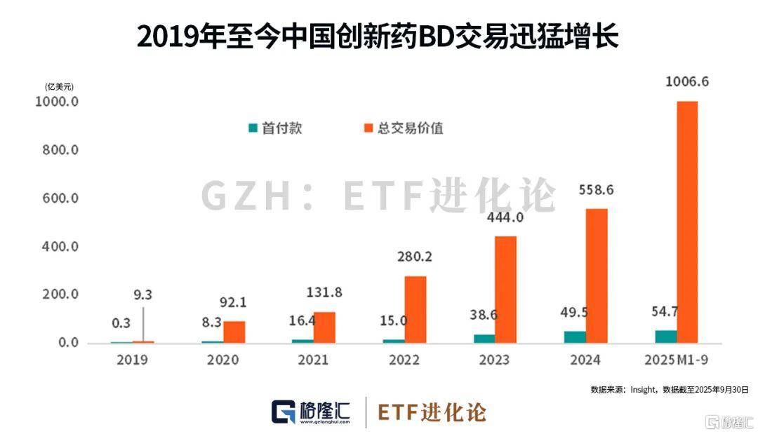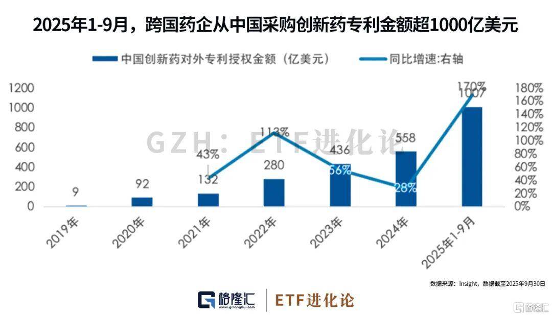 从行业基本面看,2025年是中国创新药出海的关键年份。根据Insight数据,2025年1-9月中国创新药对外专利授权交易金额突破1000亿美元,同比增长170%。中国已成为全球创新药产业的重要贡献者。以美国市场为例,花旗统计显示,美国获取的专利授权中来自中国企业的比例已从2019年的5%提升至24%,中国成为除美国外最大的创新药专利来源地。