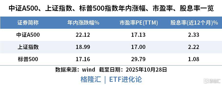 目前,中证A500指数的估值与上证指数均为17倍,低于标普500指数的30倍。从股息率来看,中证A500股息率为2.33%,高于标普500指数。