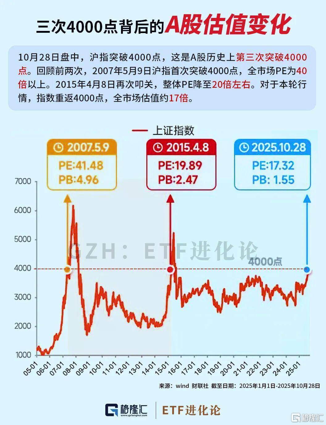 从最新估值来看,历史上沪指三次站上4000点,估值逐步降低。2007年5月9日沪指首次突破4000点,全市场PE超过40倍;2015年4月8日再次站上,整体PE降至20倍左右;2025年10月28日,沪指盘中重返4000点,全市场估值约为17倍。