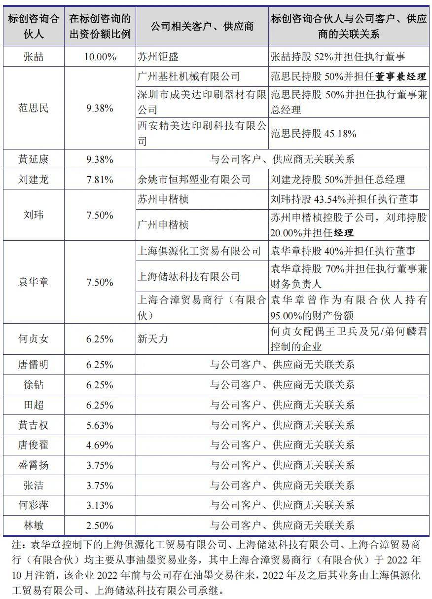 持有公司 6.31%股份的股东标创咨询的部分合伙人系公司相关客户、供应商的股东及/或董事、监事、高级管理人员,具体情况如下:
