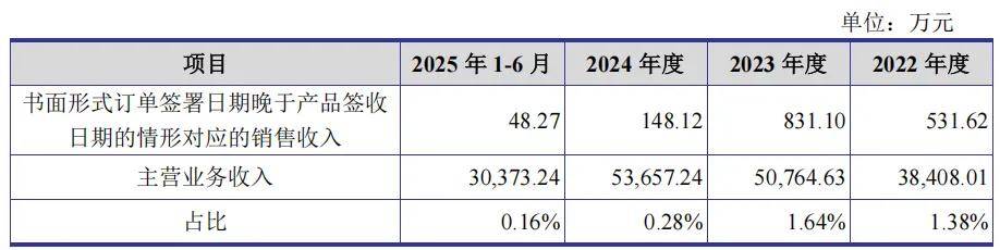 报告期内,公司书面形式订单签署日期晚于产品签收日期的情形对应的销售收入分别为 531.62 万元、831.10 万元、148.12 万元和 48.27 万元,占主营业务收入的比例分别为 1.38%、1.64%、0.28%和 0.16%,整体规模较小,占比较低。