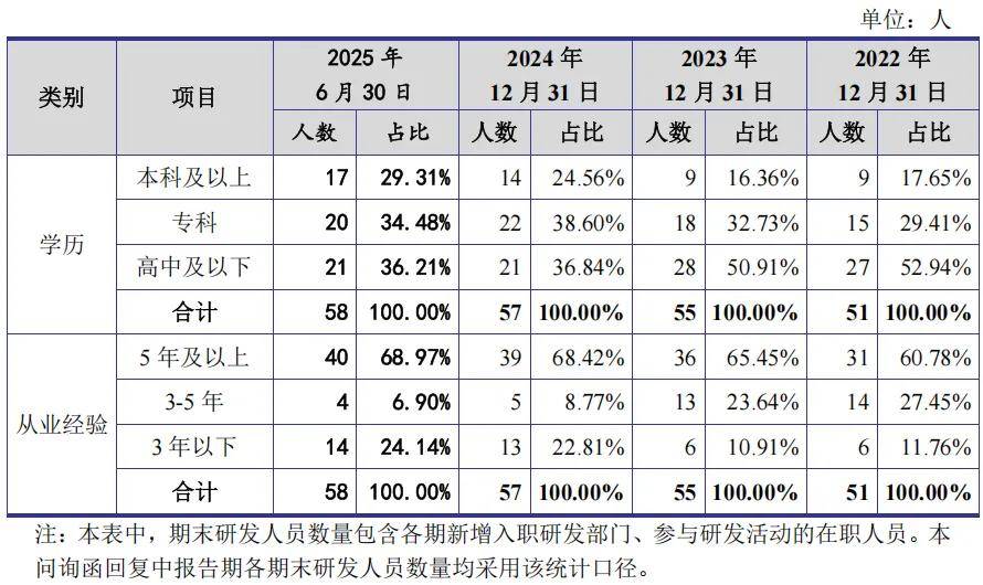 报告期各期末,公司研发人员的数量、学历构成、从业经验情况如下: