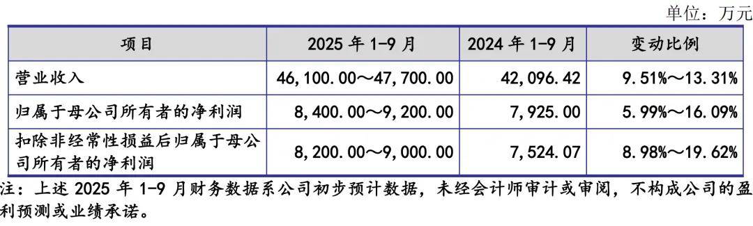 2025年1-9月,公司预计实现营业收入46,100.00万元至47,700.00万元,同比增长9.51%至13.31%;扣除非经常性损益后归属于母公司所有者的净利润 8,200.00 万元至 9,000.00万元,同比增长8.98%至 19.62%。公司预计2025年1-9月业绩增长,主要系下游市场需求增长,以及公司持续加强与现有优质客户合作并积极拓展新客户新市场所致。