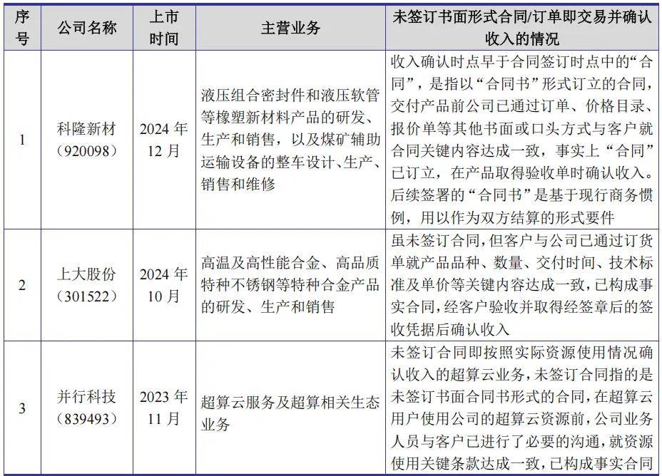 此外,经查询近期上市公司案例,存在未签订书面形式的合同/订单即交易并确认收入的情况,具体如下: