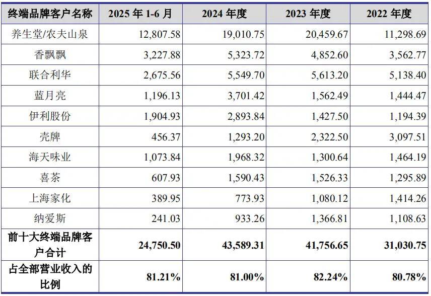 报告期内,公司对第一大客户养生堂/农夫山泉的销售金额分别为 11,298.69 万元、20,459.67万元、19,010.75 万元和 12,807.58 万元,占营业收入比例分别为 29.40%、40.29%、35.33%和 42.02%,占比较高,且存在一定波动。