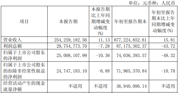 赛恩斯昨晚披露的2025年第三季度报告显示,前三季度,公司实现营业收入6.77亿元,同比增长15.81%;归属于上市公司股东的净利润0.74亿元,同比下降48.32%;归属于上市公司股东的扣除非经常性损益的净利润0.72亿元,同比下降10.78%;经营活动产生的现金流量净额0.37亿元。
