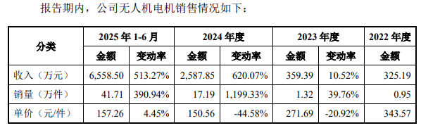 好盈科技解释称,2022年及2023年,公司主推一体化动力系统,电机单品销量整体较少,主要为销售价格较高的高功率电机; 2024年及2025年1-6月,公司电机销量大增,推出的多款低功率电机销售占比上升,平均单价明显降低。
