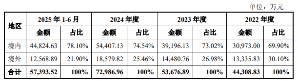 2022年至2024年及2025年1-6月,三瑞智能外销业务收入占当期主营业务收入比例分别为65.16%、71.78%、51.38%和49.13%。