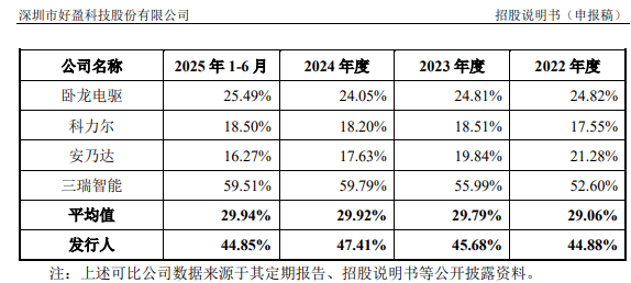 2022年至2024年及2025年上半年,好盈科技的综合毛利率分别为44.88%、45.68%、47.41%和44.85%。同期,三瑞智能的综合毛利率分别是52.60%、55.99%、59.79%和59.51%。