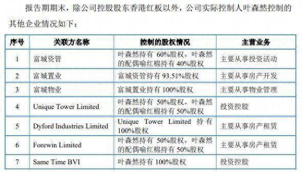 其中,富城置业主要从事房地产开发,富城物业主要从事物业管理,Dyford Industries Limited、Forewin Limited的主营业务是房产租赁。