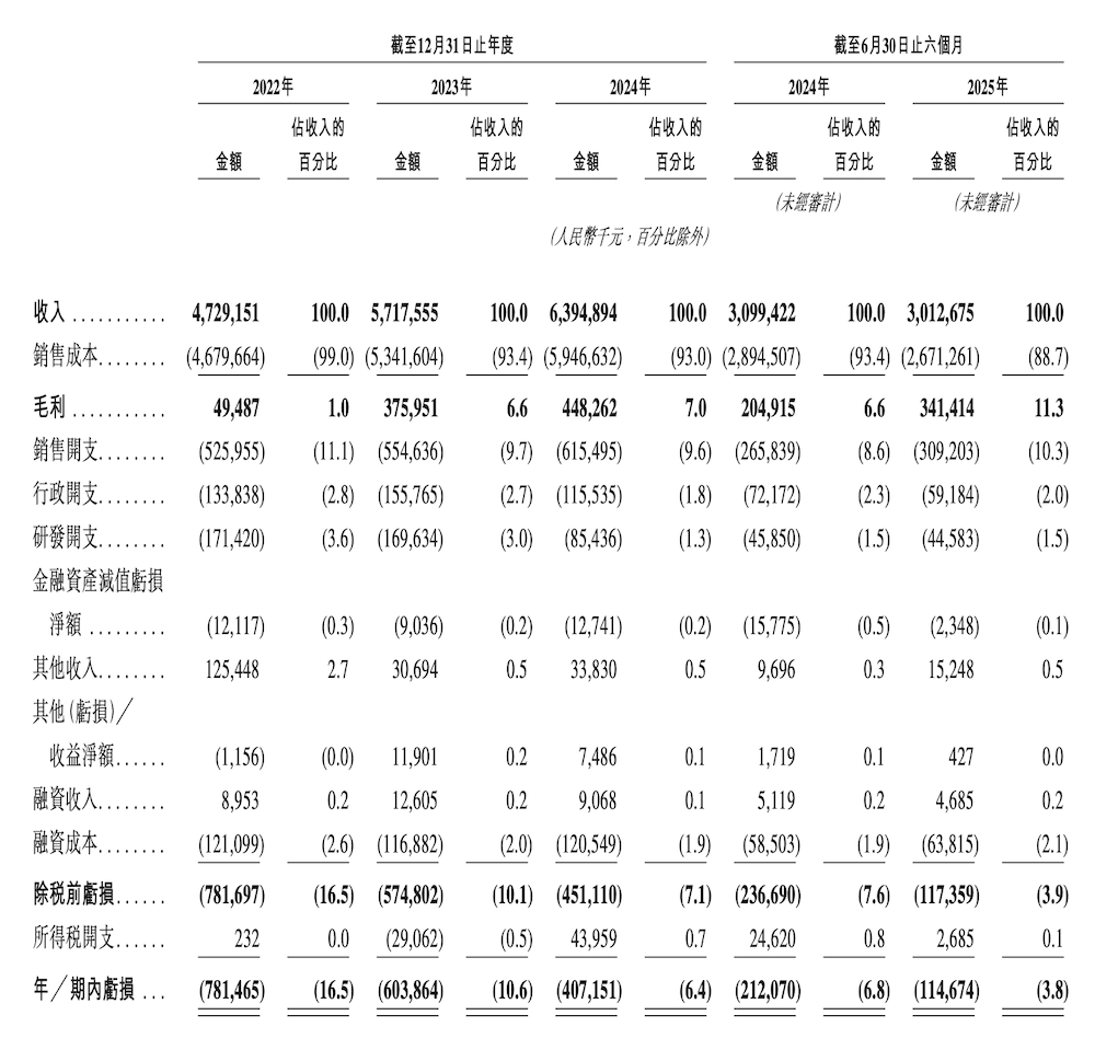 2022至2024年其净亏损分别为7.82亿元、6.04亿元、4.07亿元,2025年上半年其净亏损从去年同期的2.12亿元窄至1.15亿元, 三年半累计亏损超过19亿元。