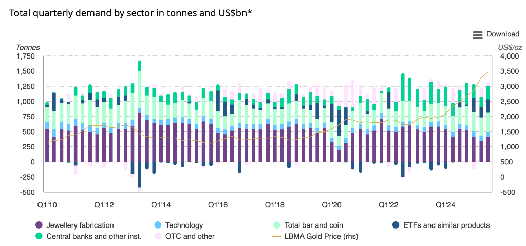报告显示,2025年三季度全球黄金需求总量(包含场外交易 )达1313吨,需求总金额达1460亿美元,创下单季度黄金需求的最高纪录。值得注意的是,同期黄金ETF资金流入创历史新高,全球资金流入达260亿美元。