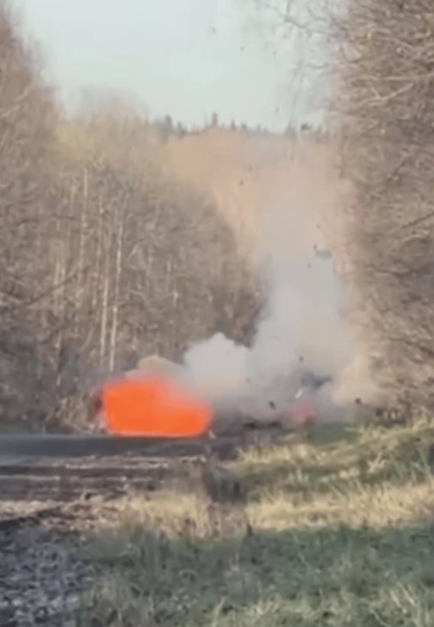 乌方发布的视频显示,一身份不明人员按下遥控器后,公路上一辆银色汽车爆炸,并燃起熊熊火焰。