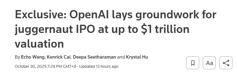 10月31日消息,据路透社报道,三位熟悉内情的人士透露OpenAI正在为首次公开募股(IPO)做准备,此次IPO可能使该公司估值高达1万亿美元,这或将成为有史以来规模最大的IPO之一。