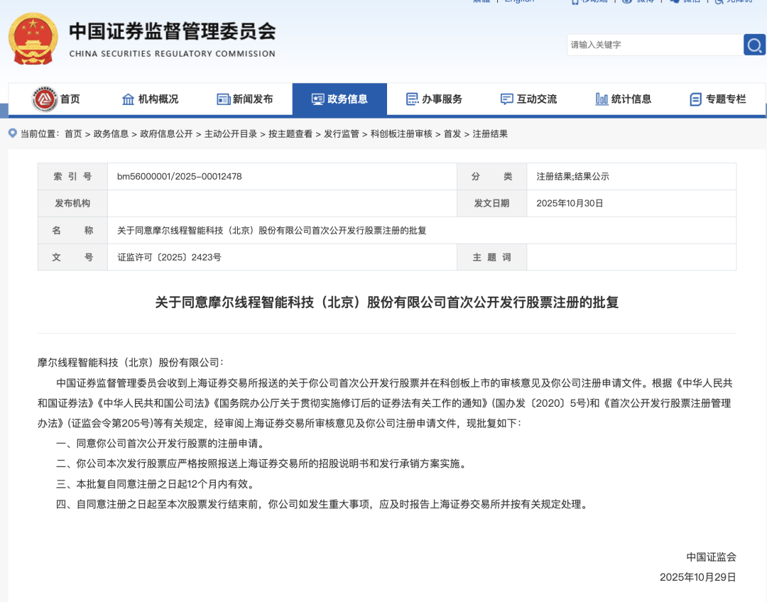 证监会官网显示, 摩尔线程IPO注册申请已获批准。